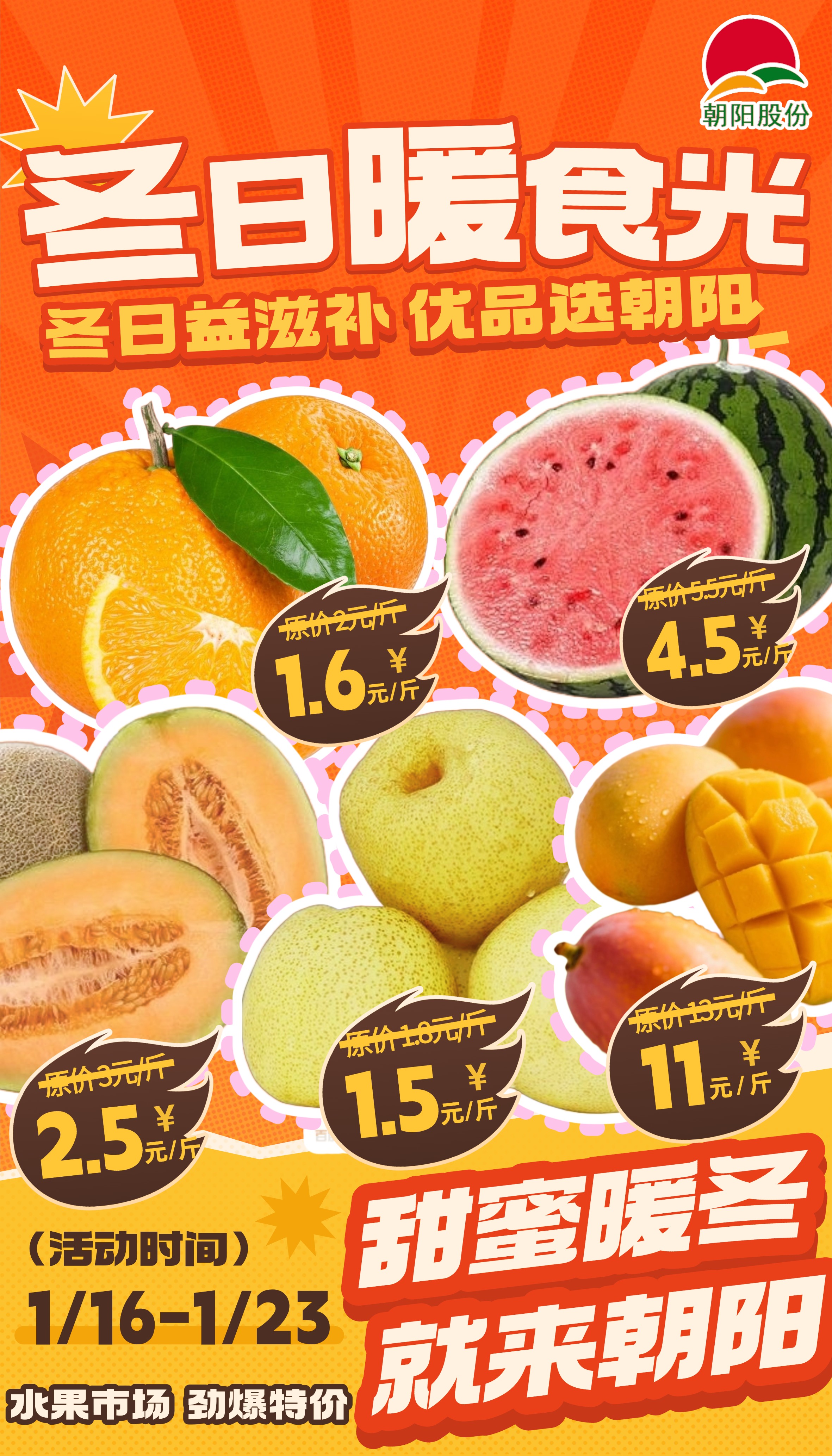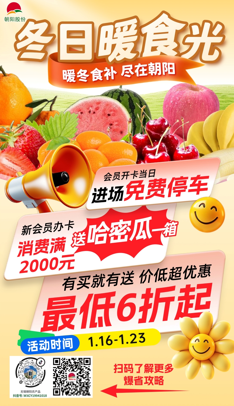 寒风凛冽,暖食暖心!当冬日的烟火气遇上实打实的采购福利,幸福感直接拉满!朝阳农产品大市场“冬日暖食光”蔬果促销活动温情启幕,1月16日-1月23日,精选当季优质蔬果,全场促销价均低于行情价,劲爆让利不停歇,为你承包整个冬日的新鲜与实惠!